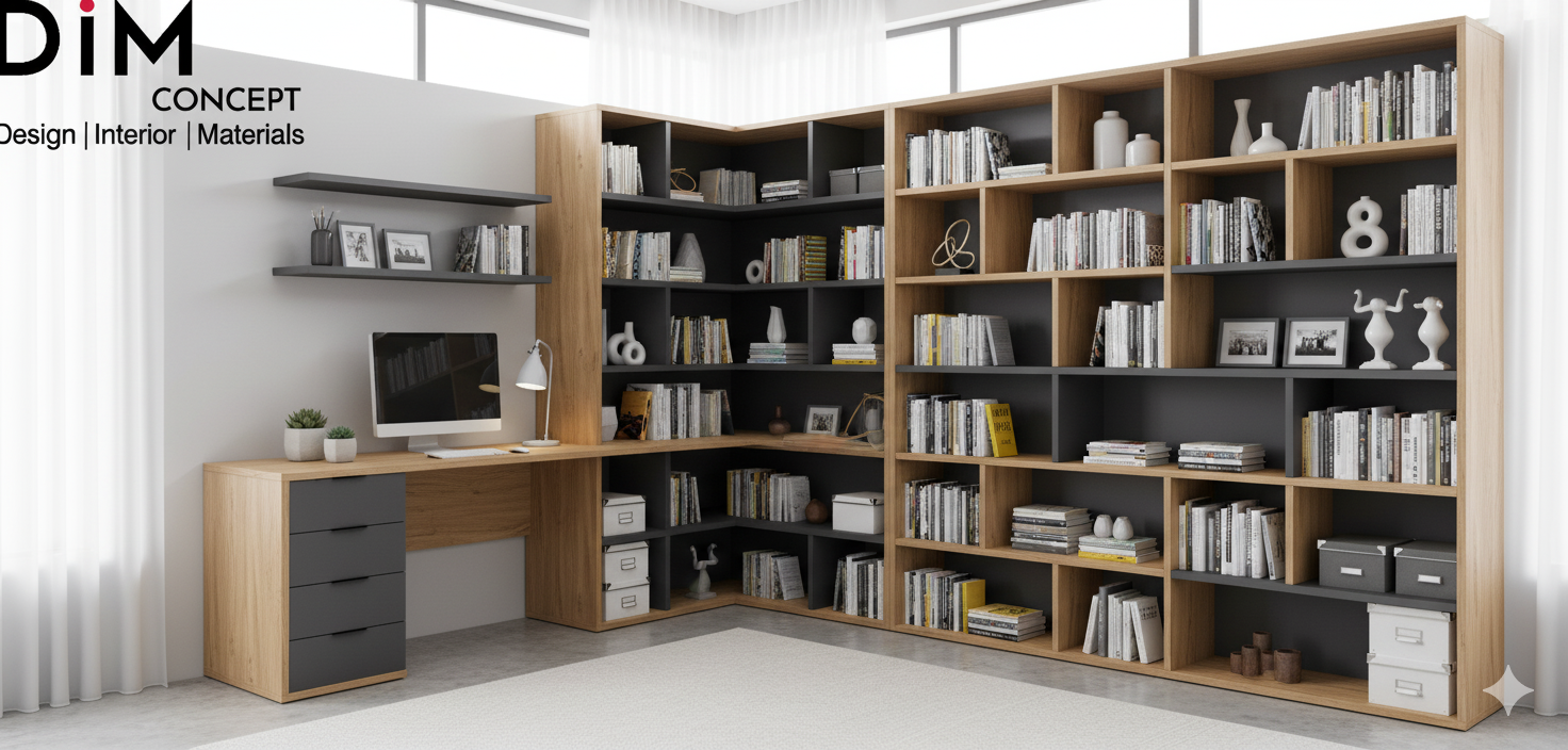 Hệ kệ sách chữ L kết hợp bàn làm việc, sử dụng hai tông màu đối lập (vân gỗ sáng và xám đậm) tạo chiều sâu. Cấu trúc module giúp tăng khả năng chịu tải và dễ dàng tùy chỉnh.